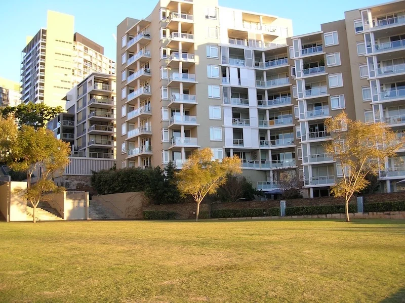 Cadi Park is largely enclosed within Jacksons Landing, frequented by fitness coaches and on-leash dogs as well as casual visitors. It is a grassy amphitheatre bounded by apartment blocks and Johnstons Bay. It is best approached on foot or by bicycle, on a wide boardwalk which encourages people to walk around the whole harbour. Well considered signage, text inlays and a reinstated yellow crane stop and crane rail illustrate the area’s history as a Colonial Sugar Refinery (CSR) wharf.