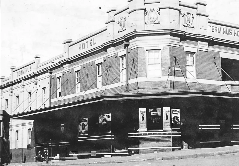 The Terminus Hotel reflected the transformation of Pyrmont. As the Coopers Arms, a single-storey structure on Harris Street, it resembled other pubs named for their patrons. By 1858 it entered official records and became a local social centre, the owners built a two-storey wing and renamed the pub, cashing in on the end of the new tram line.